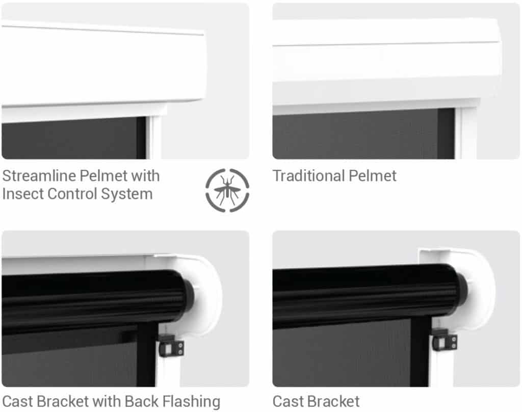 A Traditional Pelmet can also be installed, concealing and protecting your blind when retracted or a simple Cast Bracket with Back Flashing can be utilised leaving the blinds exposed but hidden from view from one side.